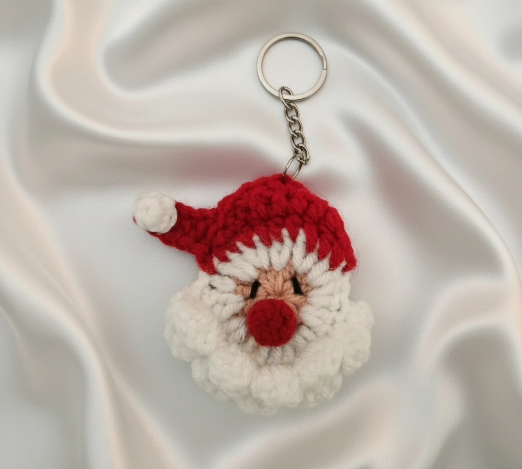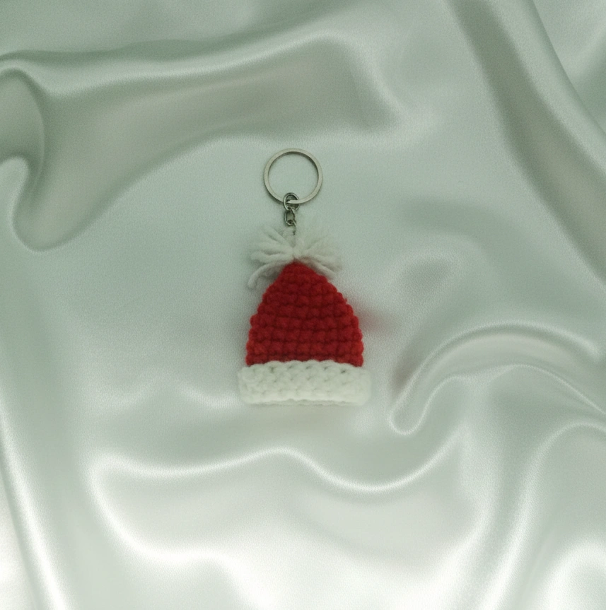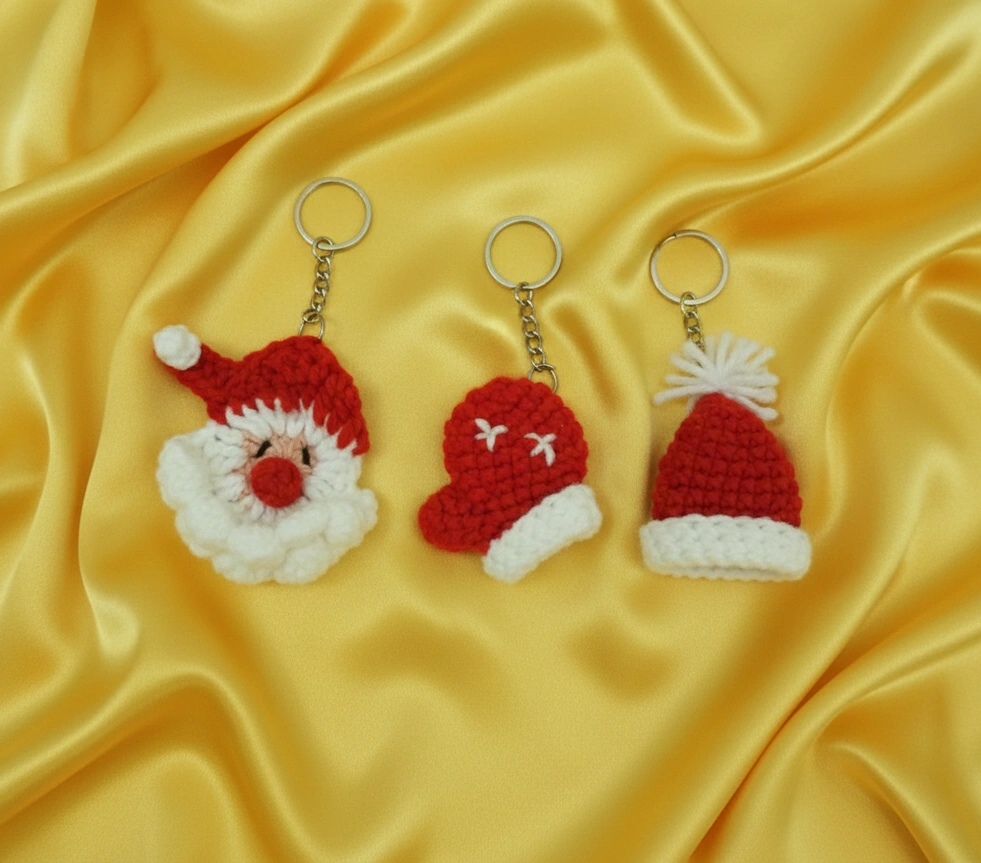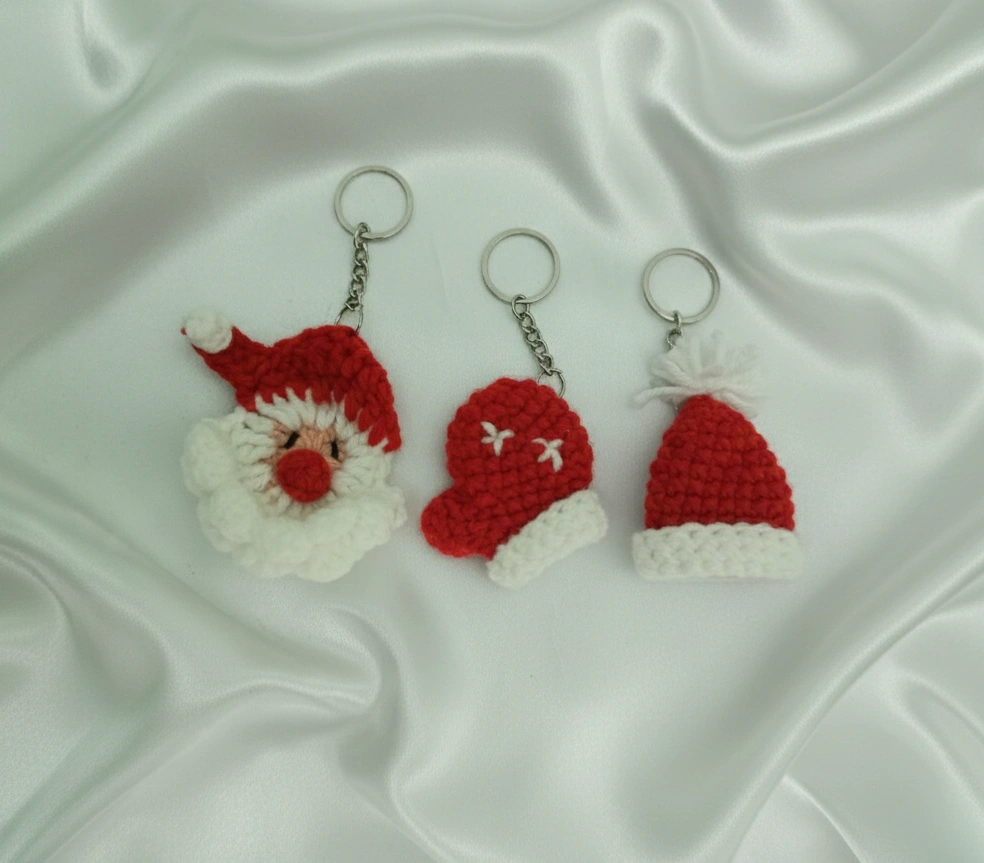Package Contains: 3 Handmade Crochet Santa Claus, Red Knit Gloves, and Hat Keychain