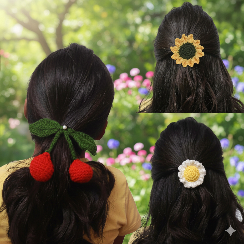 Handmade Knitted and Crochet Cherry, Sunflower & Daisy rubber band, hair band, and hair tie for women and girls (Pack of 3)