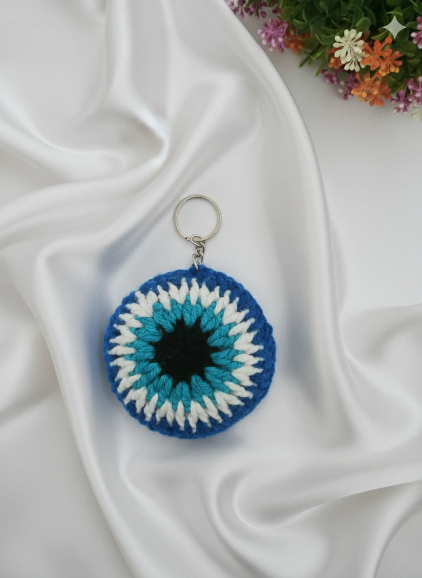 Carry a blend of style and protection with this Handmade Knitted and Crochet Evil Eye Keychain. Crafted with care using soft and durable yarn, it features a vibrant evil eye design in a mix of black, white, sky blue, and navy blue, making it a unique accessory for women and girls. Lightweight yet sturdy, this keychain is perfect for adding a handcrafted touch to keys, bags, or backpacks. Its high-quality crochet work ensures durability while maintaining a delicate, stylish look.