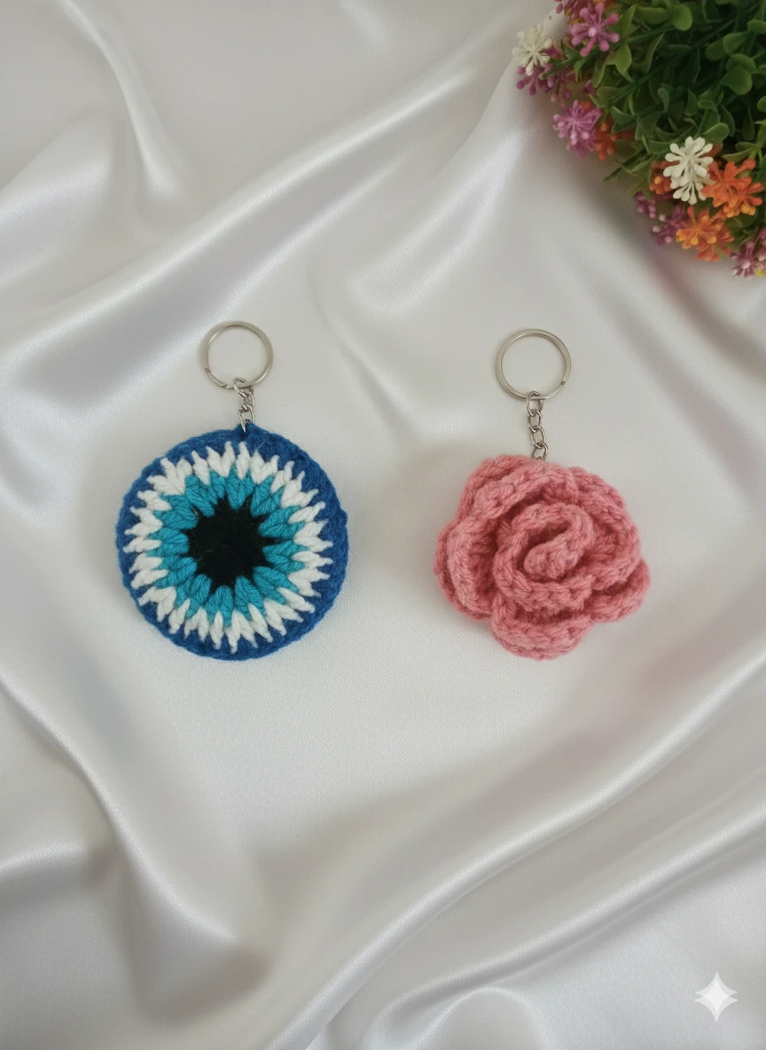 Specification: Handmade Knitted and Crochet Evil eye, White and Pink Rose keychain for women and girls (Pack of 3)