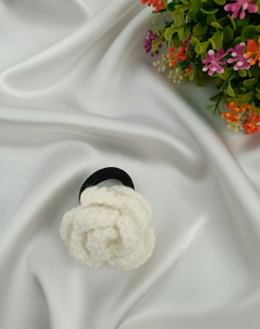 Handmade Knitted and Crochet White rose flower rubber band, hair band, and hair tie for women and girls (Pack of 1)