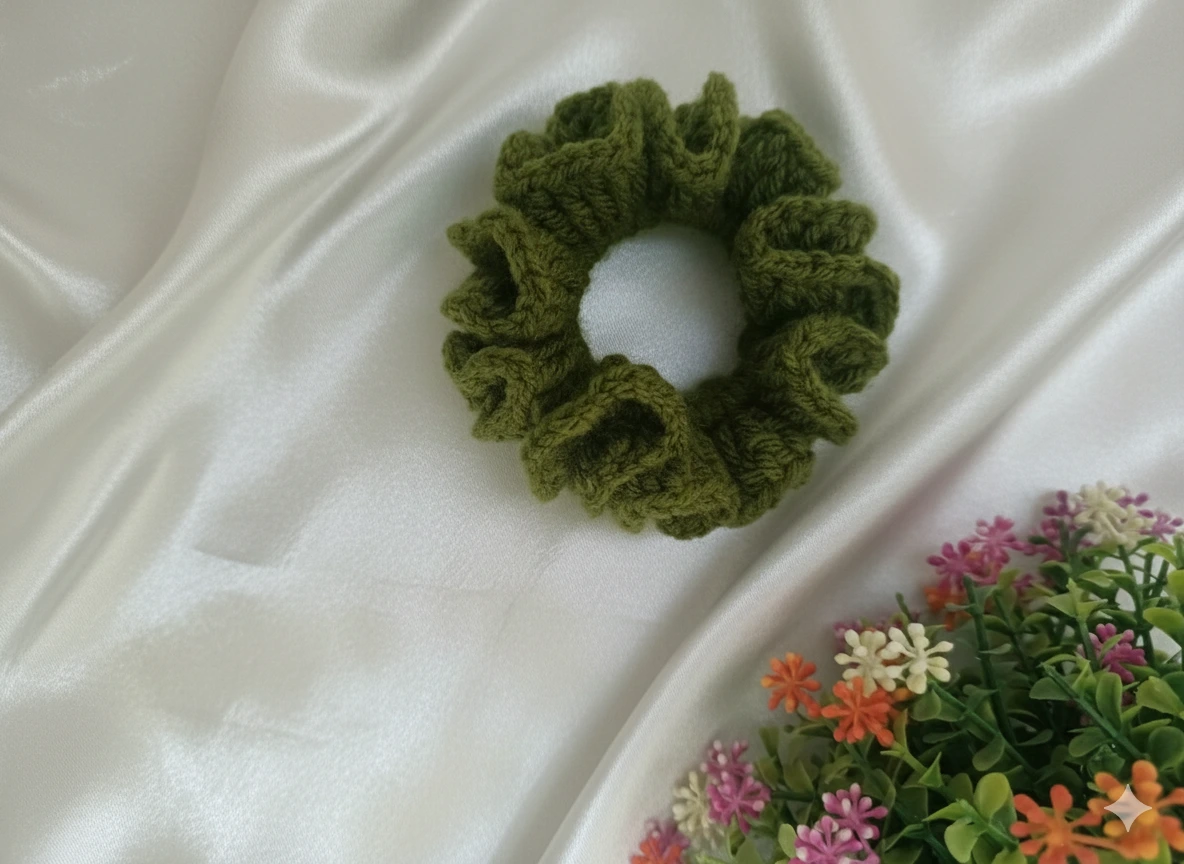 Olive Green Handmade Knitted and Crochet Scrunchie hair tie for women and girls (Pack of 1)